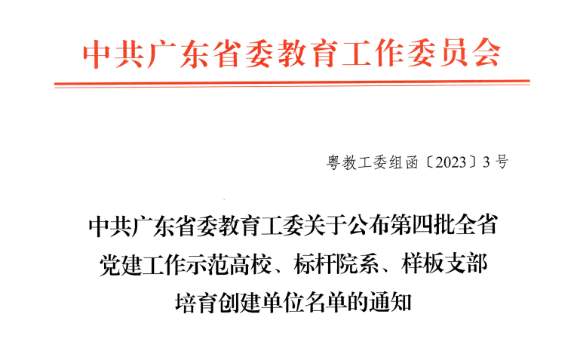 本网讯 近日,中共广东省委教育工作委员会发布了《中共广东省委教育工委关于公布第四批全省党建工作示范高校、标杆院系、样板支部培育创建单位名单的通知》。