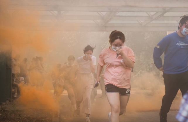 演练过程中,同学们沉着冷静,服从指挥;做到动作迅速、猫腰、掩鼻;不拥挤,不推搡,不争先恐后,不弯腰拾物,不逆向而行,有序到达安全区域。