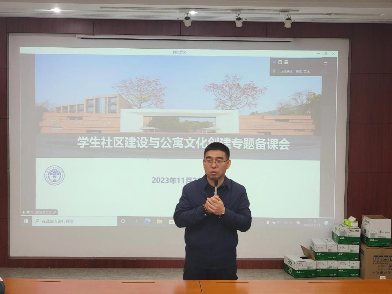 为推进“一站式”学生社区综合管理模式建设,创建和谐平安的公寓文化,提高宿舍长的管理能力,学生工作部在11月中下旬组织开展全校宿舍长培训,并于2023年11月21日上午,在白云山校区六教B108会议室和大学城校区明德书院同步开展学生社区建设与公寓文化创建专题备课会。学生工作部副部长毕建永、学生管理科科长殷毅山、学生自律委员会指导老师李智聪、刘晓琪以及各学院授课老师出席会议。