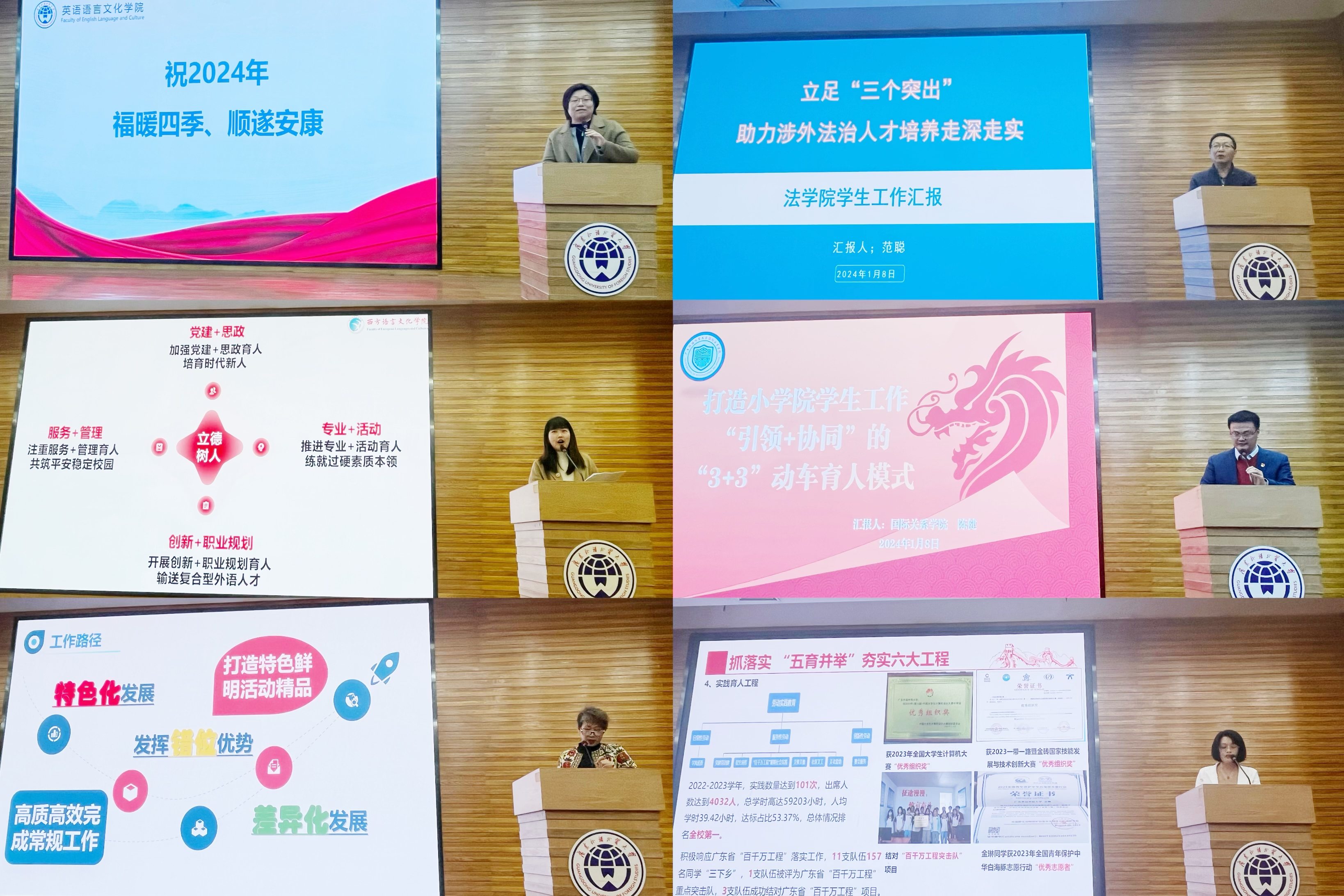 会上,6个学生工作考核优秀单位轮流进行分享汇报,围绕思想引领、党团建设、学风建设、校园文化、学生日常事务管理、队伍建设、就业创业、特色亮点等方面介绍过去一年的学生工作经验并提出2024年工作设想。
