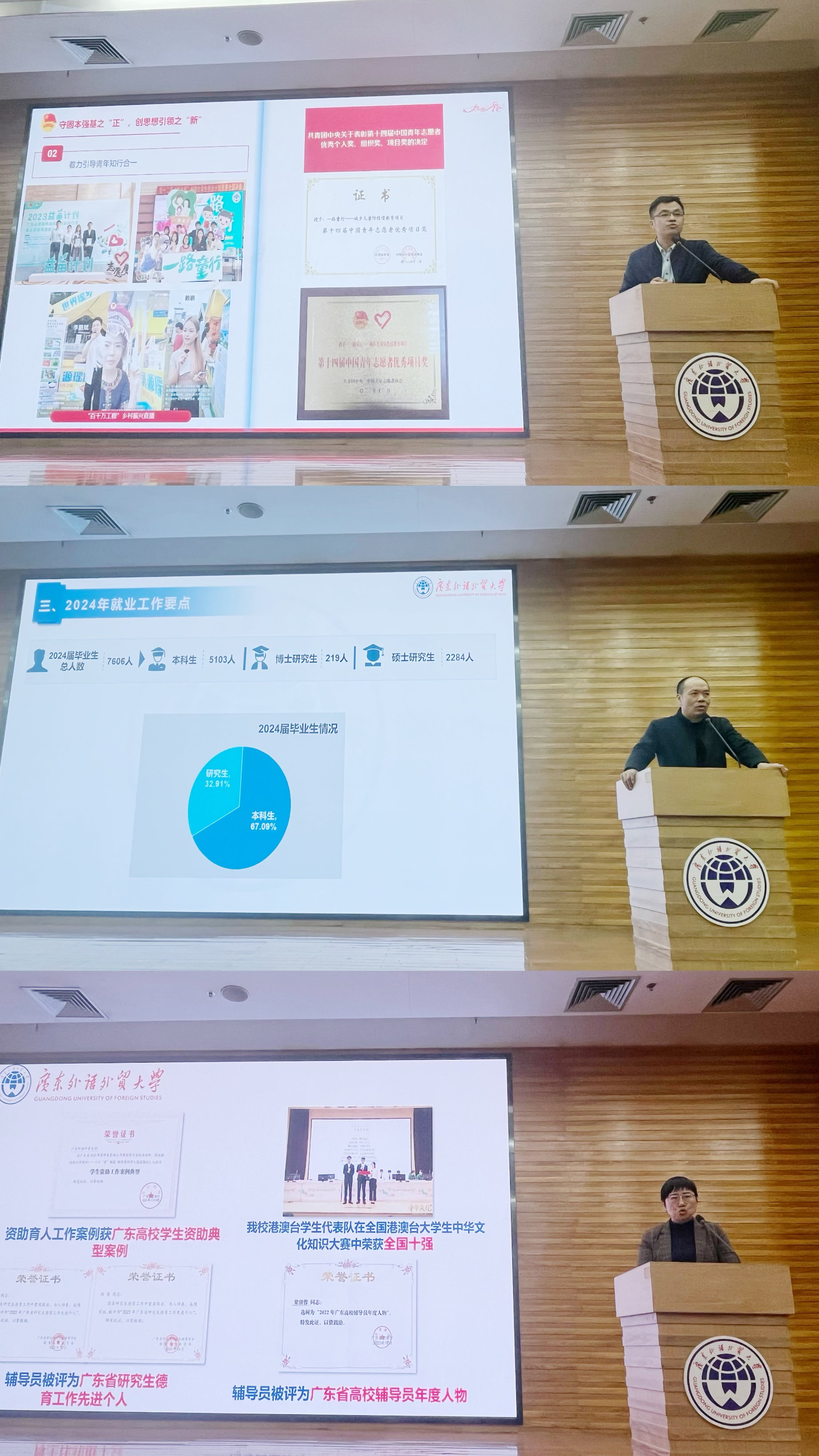会上,校团委、学生就业创业中心、学生工作部三部门先后做2023年工作总结与2024年工作布置。校团委书记刘郎以“涓流寡而成江河”为题,回顾了广外共青团2023年开展的活动以及取得的成就,并指出守凝心铸魂、为党育人、固本强基之“正”,创理论武装、立德树人、思想引领之“新”。学生就业创业中心主任康为茂以“践行三全工作理念,构建六化工作体系,促进毕业生高质量充分就业”为题,介绍了2023届毕业生就业的基本情况,并指出通过拓展多元化就业渠道、开展全链条生涯规划教育等多项举措,全力以赴推动毕业生高质量充分就业。学生工作部部长国佳以“踔厉奋发,勇毅前行,推动学生工作高质量发展”为题,从思想政治引领、平安校园建设、优良学风涵育、学工队伍建设、精准服务育人五个方面总结2023年开展的特色学生工作,并提出了2024年工作要点。