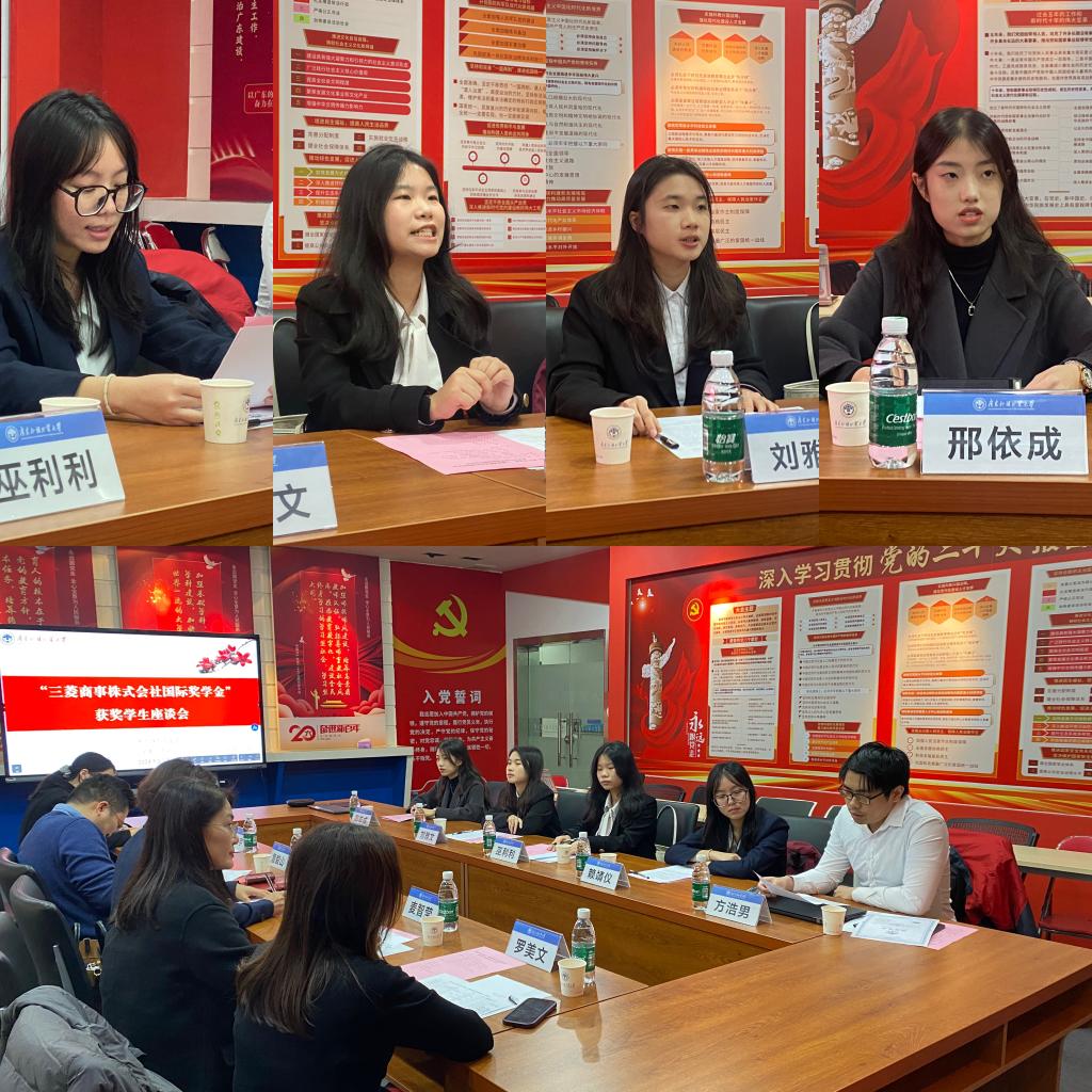 3月7日下午,2022-2023学年度“三菱商事株式会社国际奖学金”获奖学生座谈会暨表彰大会在白云山校区六教B106会议室举行。捐赠单位代表三菱商事(广州)有限公司总经理张月华女士、管理部长代行麦智莹女士、人事高级经理罗美文女士、学生工作部学生管理科殷毅山科长、于力宇老师、陈润旭老师以及2022-2023学年“三菱商事株式会社国际奖学金”获奖学生参与本次活动。