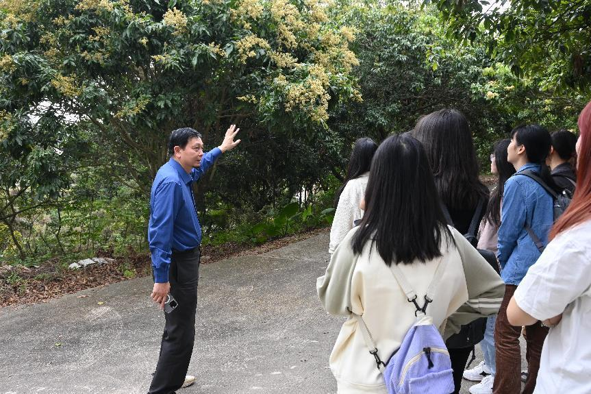 随后,师生们在伦炳强先生的带领下参观了农业基地,看到了荔枝、杨桃、砂糖橘、木瓜、番石榴等不同果木,实地了解不同果树生长的周期和养护知识。