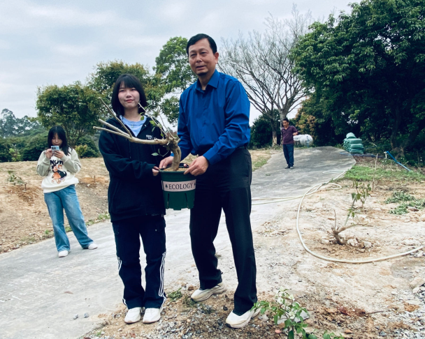最后,大家共同种下了师生们从广外凤凰山带来的三角梅。伦炳强先生也回赠了基地的三角梅,并嘱咐师弟、师妹们带回心理中心种植、养护,让校友的情谊茁壮生长。