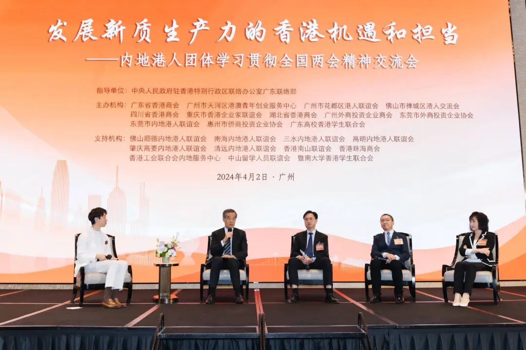 2024年4月2日下午,“发展新质生产力的香港机遇和担当——内地港人团体学习贯彻全国两会精神交流会”在广州隆重举行。交流会由中央人民政府驻香港特别行政区联络办公室广东联络部指导、广东省香港商会、广东高校香港学生联合会等12个机构联合主办。