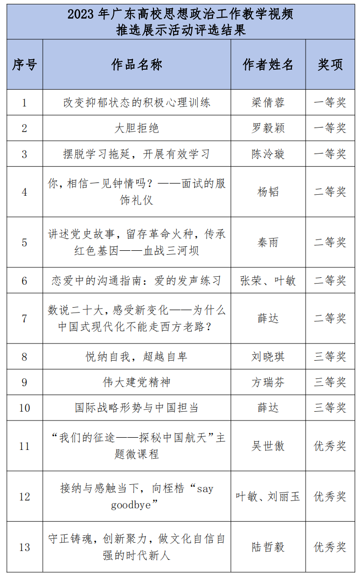 我校积极组织辅导员队伍参与本次活动,经评委和专家评审,活动结果于近日公示。广东高校思想政治工作优秀论文中,我校有8项作品获奖,其中一等奖2项、二等奖1项、三等奖3项;广东高校思想政治工作优秀案例中,我校有9项作品获奖,其中一等奖2项、二等奖2项、三等奖2项;广东高校思想政治工作教学视频中,我校有13项作品获奖,其中一等奖3项、二等奖4项,三等奖3项;广东高校思想政治工作原创文化精品推选中,我校有9项作品获奖,其中一等奖1项、二等奖2项、三等奖1项。