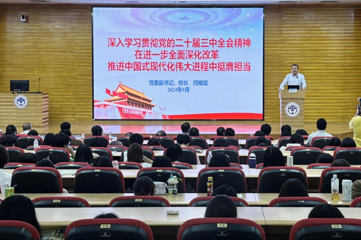 课上,闫相斌以“深入学习贯彻党的二十届三中全会精神,在进一步全面深化改革推进中国式现代化伟大进程中挺膺担当”为主题,系统阐释了党的二十届三中全会精神内涵、新时代教育强国建设中的广外举措等内容要点。闫校长强调,高校作为科技第一生产力、人才第一资源、创新第一动力的重要结合点,是助力新质生产力加快形成的重要力量。他指出,要加快文文交叉、文理融通、文工结合,推动与湾区教育合作,凝心聚力、争创一流,开创学校高量发展的新局面,在教育强国建设伟业中书写新的华章。