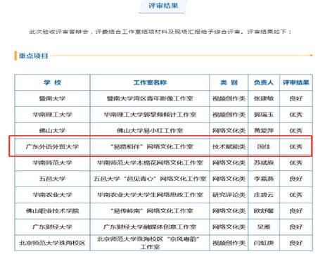 10月29日,由广东高校网络思政工作中心举办的第三批广东高校网络文化工作室验收评审答辩会在佛山大学举行。来自全省20个省级网络文化工作室的代表参与现场汇报及答辩。我校“易路相伴”网络文化工作室结合工作室“五个一”建设目标的完成情况以及工作亮点和成效进行汇报,经答辩评审,最终获评重点项目考核“优秀”等次,并被授予“广东高校网络文化工作室(重点项目)”牌匾。