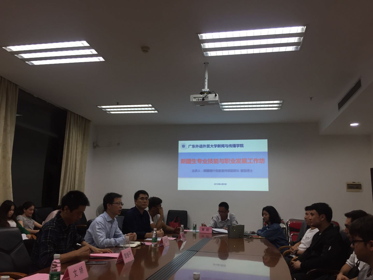 本网讯 为提升新疆学子就业技能、树立正确的就业观念,以及提供更多就业择业机会和平台,4月9日晚,新闻学院邀请新疆喀什地委宣传部副部长曾励博士为我校新疆学生开展专业技能与职业发展工作坊。学生工作部(处)学生科科长曾继平,新闻学院院副院长何国平,党委副书记黄石胜,辅导员陈博菲、张维以及各学院的新疆学生参加了本次工作坊。