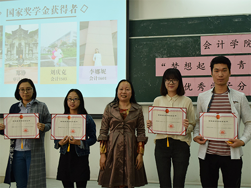 黄晓梅向获得2016-2017学年度国家奖学金的四位同学颁发了荣誉证书,并给予了他们充分的肯定,鼓励他们再接再厉,争取更大的荣誉。