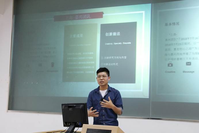 接下来,是北京-西柏坡、上海-嘉兴、贵阳-遵义和西安-延安等四支调研队伍汇报。上海-嘉兴队以"传承红色基因,重走初心之路"为主题进行了为期8天的实践活动。队伍以线上和线下相结合的方式探索红色资源在当地的传播情况,在嘉兴南湖革命纪念馆和南湖红船调研期间,还得到校党委书记隋广军书记亲临慰问指导,参加了隋广军主持的座谈会,并见证了我校与嘉兴南湖革命纪念馆共建思想政治教育基地合作签约揭牌仪式。团队代表示虽然调研过程遇到台风天,室外高温,采访对象难找,拍摄被拒等困难,在指导老师的指导和帮助下,仍然顺利完成了整个调研活动。