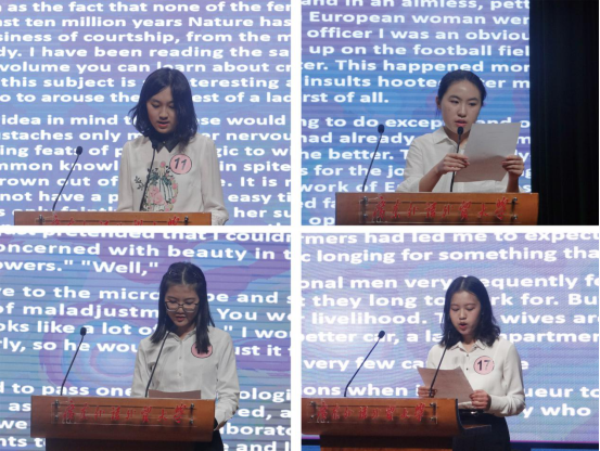 紧接着是本科生组比赛。本科生组比赛分为短文朗诵和电影配音。在短文朗诵环节,选手们随机选取三分钟左右的英文文章进行朗读,文章包括《大学时光》、《求偶古今论》等。选手们语调抑扬顿挫,层次丰富,语音圆润流畅,令人赞叹不已。在电影配音环节,各位选手声临其境,用声音诠释影片,演绎了《冰雪奇缘》里的姐妹情深、《至爱梵高》里激烈的争执和《傲慢与偏见》中紧张的冲突等对声音表现力要求较高的情节,为观众带来了一场情感与语音交汇的盛宴。