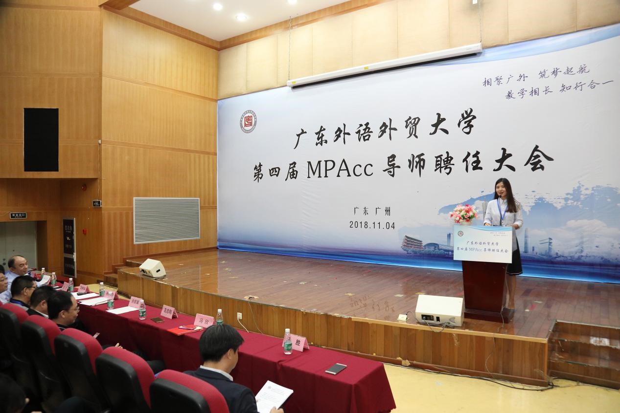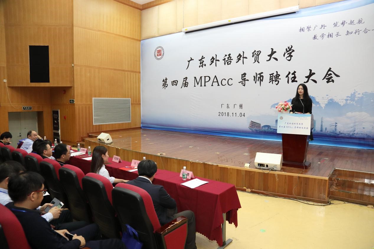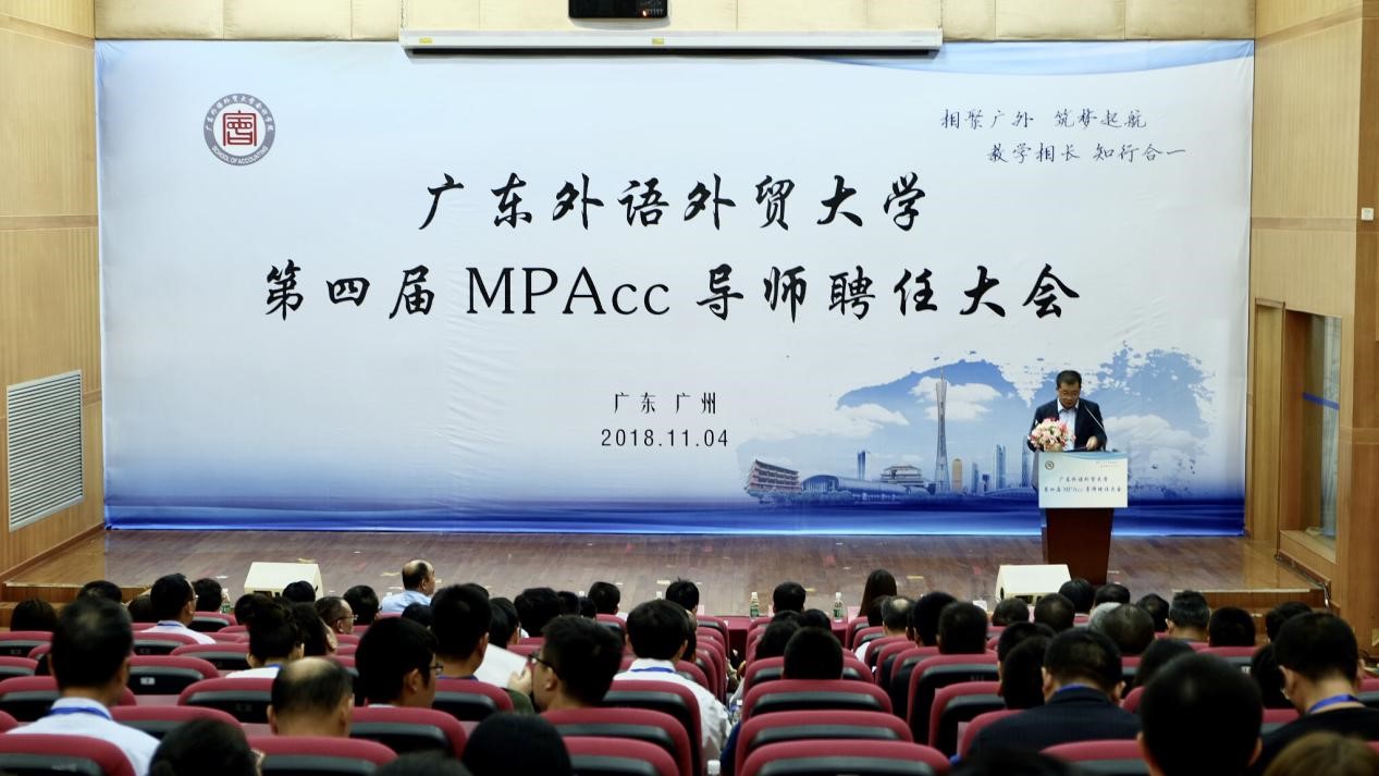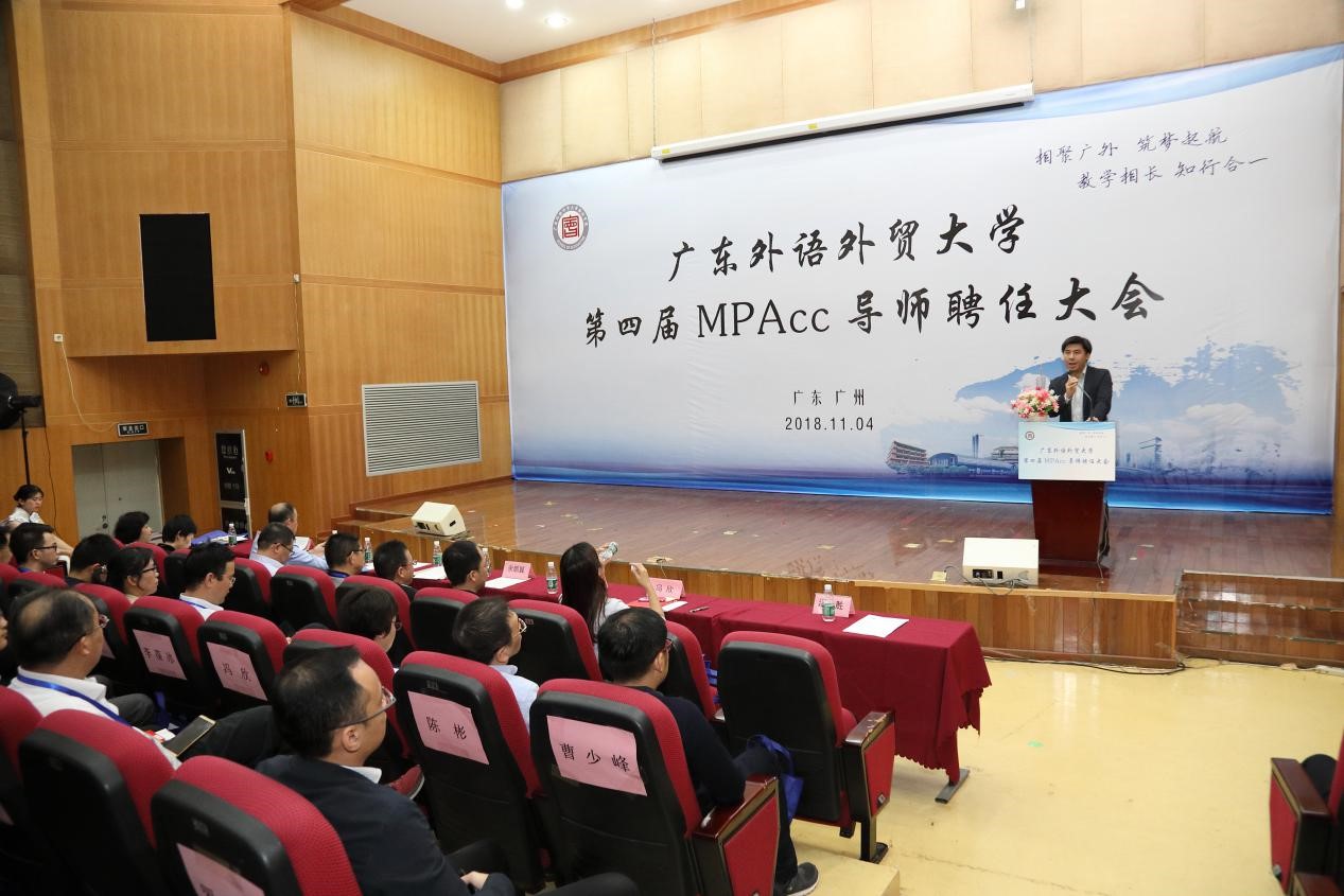 11月4日上午,广东外语外贸大学第四届MPAcc导师聘任大会在南校区图书馆报告厅如期举行。中国联合网络通信集团有限公司财务部副总经理陈沛,学校审计处余鹏翼处长,会计学院刘中华院长、孙家和书记、汤胜副院长、左志刚副院长、蒋基路副院长出席大会。来自本校及社会各界的85名校内外导师与150余名2018级研究生新生正式见面。大会由汤胜副院长主持。