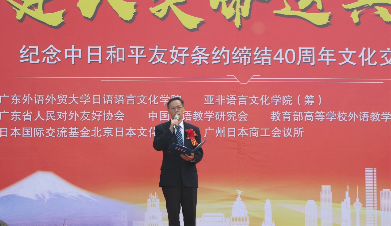 活动开始前,在红地毯上进行了舞狮和花鼓表演。随后嘉宾入场落座,由日语学院、亚非学院(筹)院长陈多友主持开幕式。广东外语外贸大学副校长陈林汉、广东省对外友好协会副会长欧阳江旋和日本驻广州总领事副领事大圣寺利幸先后致辞,他们均表达了对中日文化友好交流的美好期望。