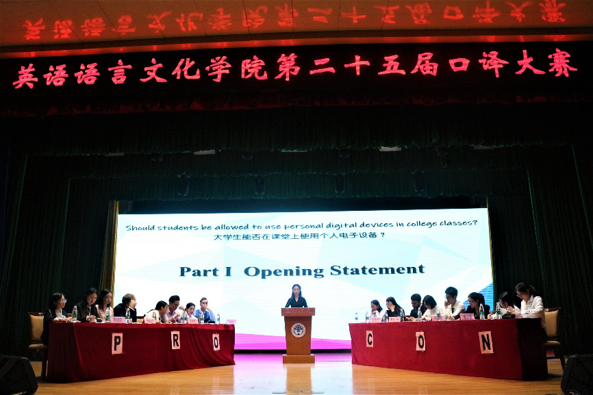 比赛在正反方一辩针锋相对的开场陈词中拉开序幕。正方一辩James认为学生上课注意力不集中的根源是老师的教学质量不高,而并非沉迷电子设备,合理使用电子设备能够丰富教学内容。而反方一辩王简月则认为,学生使用个人电子设备是他们注意力不集中的根源,禁止使用电子设备能够提高学生专注度,便于课堂管理,培养学生独立思考能力,形成良性循环。攻辩环节,正反方二辩就大学使用电子设备对学生未来进入社会的影响激烈争锋。正方二辩湛睿哲认为大学生经过适当教育就能够合理使用电子设备,并举了医生忙于“偷菜”导致婴儿不治身亡的例子,说明大学教育学生合理使用电子设备的重要性,二号译员李锦滢沉着冷静,准确翻译出“偷菜”这个网络词语。正方三辩Robert将电子设备上升到科技的高度,指出当今社会科技对教育的促进作用是不容忽视的,而反方三辩杨家玮则坚持认为电子设备更适于在课外使用,课堂上只会限制学生的独立思考能力。七号译员柳生幸一紧跟辩手的思路,几乎无停顿地中译英,沉着冷静,气场全开。正反方四辩继续深入探讨之前提出的问题,正方四辩李晓蕊提问尖锐,回答逻辑严密,并指出本次辩论关键,令在场观众拍案叫绝。正方二辩和反方三辩以自身为例,你来我往。正方二辩认为需要让学生自己认识到错误,而不只是简单地禁止使用电子产品,正方一辩追加观点“错的不是工具,而是坏人”。而反方三辩则坚持禁止电子产品使用可以有效提高学习效率,反方批评正方缺乏数据支持,过于理想化。比赛进入白热化阶段,双方辩手语速明显加快,这也给译员的翻译增加了难度,但是译员们都表现出了极强的抗压能力,紧跟辩手们的思路,沉着应对“不入虎穴,焉得虎子”“你的良心难道不会痛吗”等高难度语句,展现出了作为译员应当有的素养,赢得了在场观众的阵阵掌声。总结陈词环节,反方四辩指出当代大学生应当减少对电子设备的依赖,培养独立思考能力,提高学习的效率。而正方四辩认为电子设备并不是导致学生在课堂上注意力分散的根源,禁止使用电子设备是没有效果的。