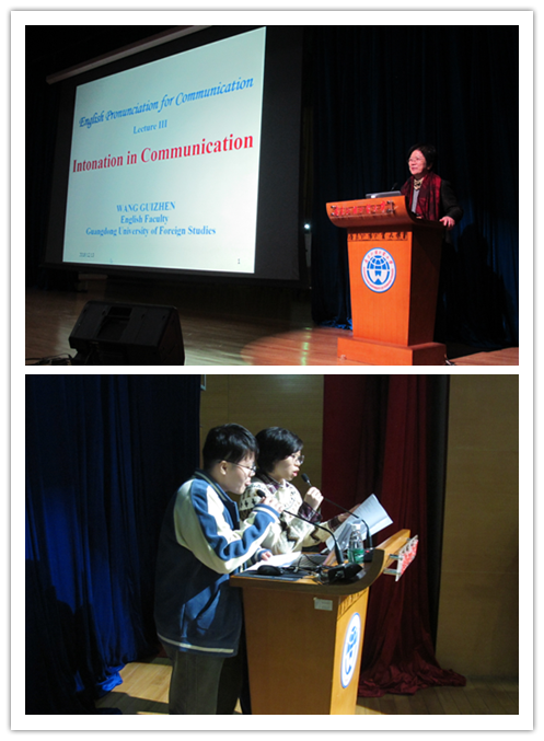 大会邀请国内著名英语语音语调专家王桂珍教授作英语语调的讲座。讲座内容涵盖了语调的类型、结构,使用情况和作用等,具有高度的系统性、条理性和启发性,令同学们受益匪浅。