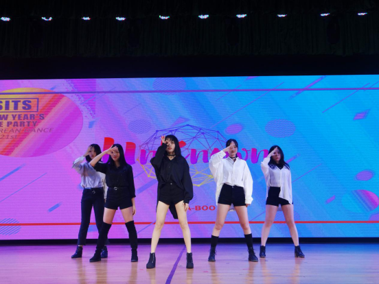 在全体教职工深情的合唱声中,晚会拉开了序幕。教师们为大家带来了周华健的《朋友》,台下的学生轻声跟唱,摆动双臂,现场氛围格外融洽。一曲唱毕,李和民书记携学院领导老师祝愿同学们新年快乐,预祝大家在新的一年中学业精进、健康快乐,同时祝愿高级翻译学院越办越好。紧接着,六位博士生带来的肚皮舞以曼妙动人的舞姿迅速抓住了观众的眼球,全场氛围被彻底带动了起来。