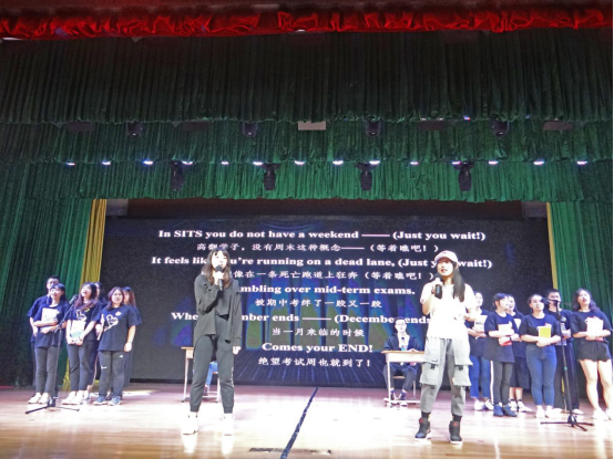 而本科1701班结合流行唱法与rap的音乐剧《我爱高翻》更是让人印象深刻,讲述高翻学生的日常学习和生活,歌词幽默有趣,每一句都道出了同学们的心声,现场氛围被再度推向高潮。紧接着,翻译1701、1702、1703、1802和1803的同学们则带来了动感十足的舞蹈串烧节目Unknown,活力四射的舞姿使现场氛围持续火热。最后,校歌队为现场观众带来了极具故事张力的压轴歌曲SaveMe fromMyself和《不该》。