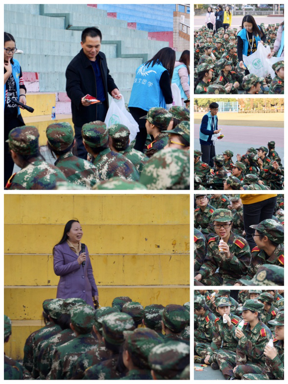 英文团学主要学生干部和朋辈导师为同学们送来了慰问品,为艰苦训练中的18级新生带来关怀与慰问。