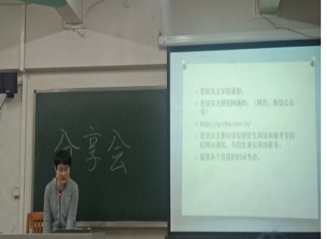 在分享会开始之前,学院辅导员颜梁柱做动员讲话。他介绍了学院往届本科生的毕业去向,简单分析了当前的就业形势,并希望同学们根据自身特点,认清形势,尽早明确方向和付之行动。