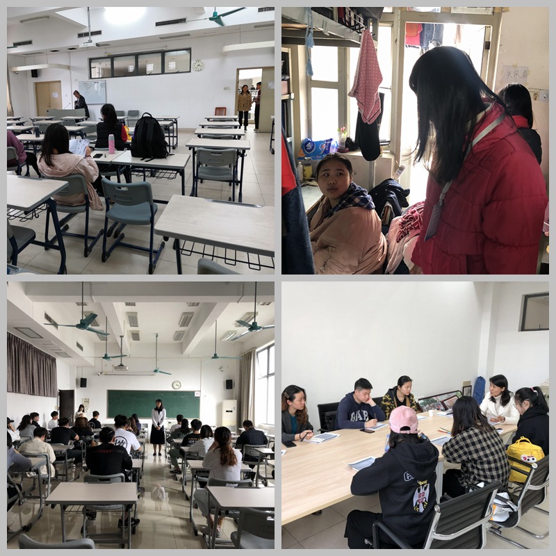 为扎实推进辅导员工作“进课堂、进宿舍、进学生活动、进网络”,把“四进”工作和思政工作有机结合起来,学院党总支副书记张莉、辅导员邓煜、谭珺如开学至今多次深入学生课堂、宿舍、活动、网络。学工团队每周抽查学生课堂考勤情况,排查学生宿舍用电安全隐患,个性化解答各年级学生在学业、择业、人际交往、生活各方面困惑,指导团委学生会、心理援助队等学生活动,及时转发各类公众号思想引领类推送,促进对大学生常规教育和管理工作“落实落细落小”。