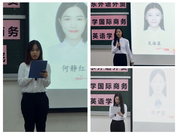 大会依次听取、审议了商英学院第十四届学生会工作报告、《广东外语外贸大学国际商务英语学院学生会章程(草案)》的说明,通过了《广东外语外贸大学国际商务英语学院第十五次学生代表大会选举办法(草案)》。按照差额不低于20%的要求,全体学生会委员候选人进行了现场竞选演讲,经代表投票、现场计票等,何静红等11位候选人成功当选为商英学院第十五届学生会委员。