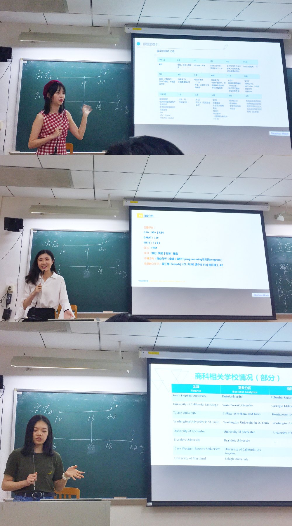 在另一场分享会,成功申请国外高校的三名学生代表陈蔚昕(考取香港科技大学)、郑庆惠(考取爱丁堡大学)、郑诗晴(考取哥伦比亚大学)分别对本科海外交换项目、港校申请程序、英国高校申请经验、文书写作技巧、美国高校申请、时间规划等方面进行了具体且实用的分享。郑诗晴鼓励同学们不要轻易被一次失败打倒,要找到适合自己的“打鸡血”的方式。