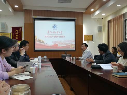 为深入学习贯彻第四次党代会精神和提高学院中层干部思想觉悟、业务水平,金融学院于11月29日下午召开“学校第四次党代会精神宣讲暨干部培训会议”,校第四次党代会精神宣讲团成员、校党委常委、副校长何传添教授为师生宣讲解读学校第四次党代会精神,财务处结算中心科长刘帼眉、经贸学院国贸系教工党支部书记田云华博士以及金融学院分管教学副院长杨菁菁教授进行相关业务培训。学院领导班子成员,各党支部书记、支委,各系主任、副主任、学生党建骨干参加了此次活动。活动由金融学院党委书记徐昶斌主持。