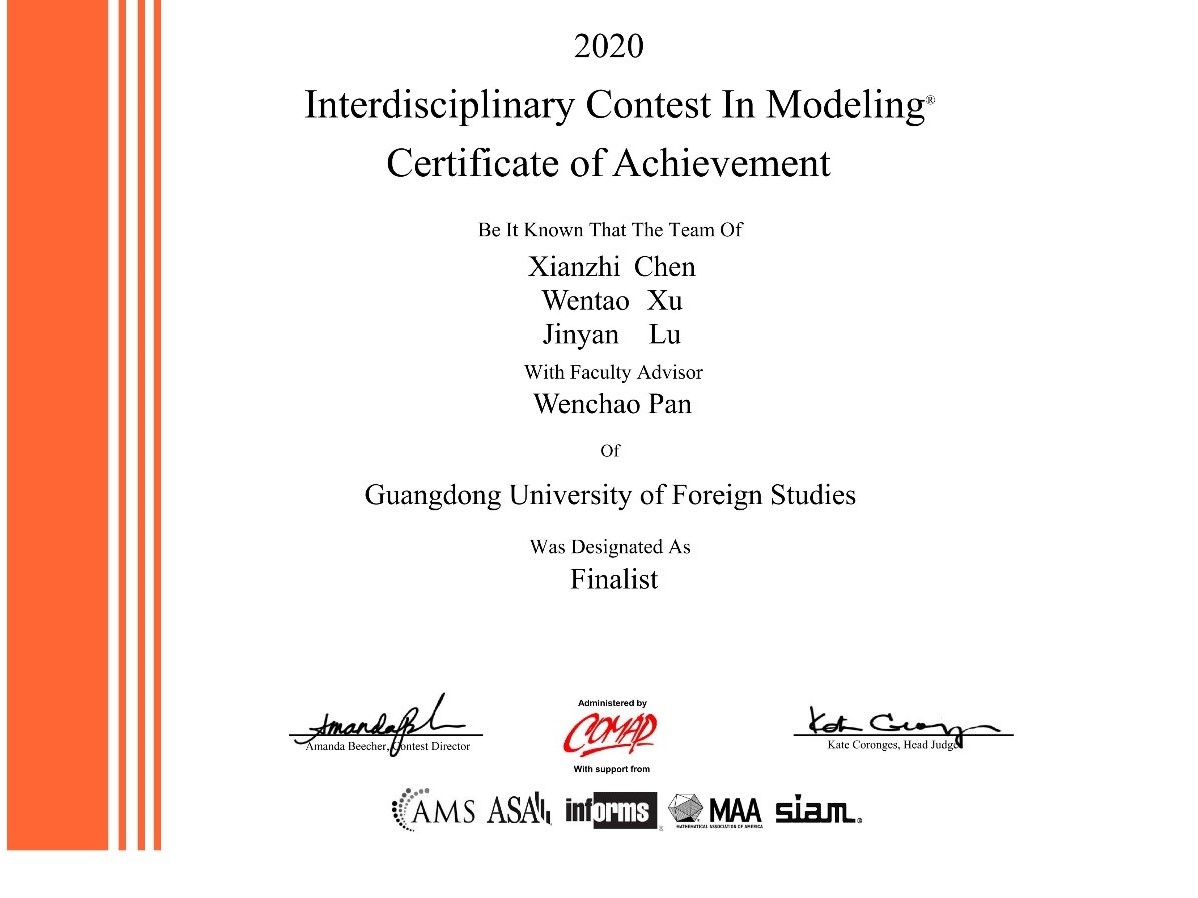 近日,2020年美国大学生建模竞赛/交叉学科建模竞赛(MCM/ICM)获奖名单在其官网揭晓,商学院学生组成或参与的参赛队伍荣获特等奖提名奖(F奖)1项、二等奖(H奖)1项、三等奖(S奖)3项的优异成绩。