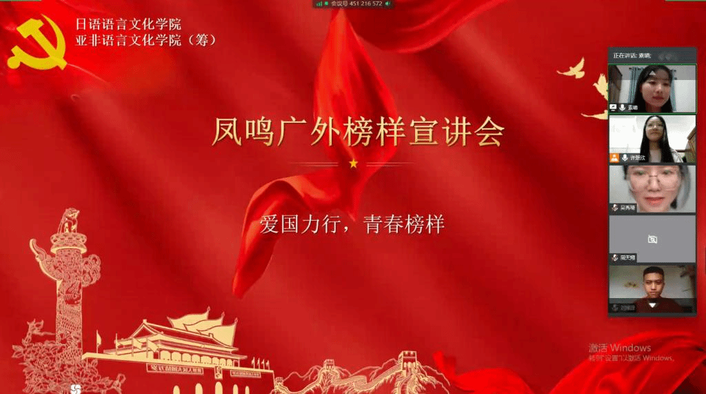 本网讯 为充分发挥优秀学生的先锋模范作用,并在新冠肺炎疫情的特殊期间,培养学生的责任意识,激励广大学生成才报国,5月21日下午,日语学院、亚非学院(筹)线上顺利开展了以“爱国力行,青春榜样”为主题的“凤鸣广外”榜样宣讲会。学院党委副书记曾智鹏,辅导员许楚欣,2018-2019年度国家奖学金和国家励志奖学金获得者代表以及全体19级新生参加了本次宣讲会。宣讲会由辅导员许楚欣主持。
