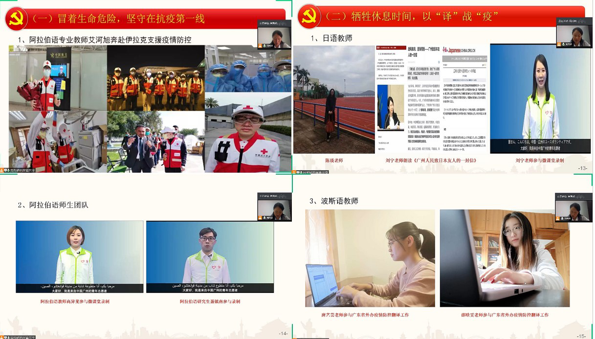 陈多友院长以“守望相助、共谋发展”为主题,从专业学术的角度分析了新冠疫情对当今世界尤其是中日关系的影响,号召青年学生既要学会感恩党和祖国的强大为我们赢得的自豪感和幸福感,又要放眼未来,才能赢得共同发展和进步。陈院长还带领大家重温了我校党委书记隋广军的党课精髓,要把校园疫情防控作为最首要、最基本的任务;要积极响应国家重大号召,发挥专业特长,积极投身志愿服务,展现广外人的担当;要积极开展学术战疫,为国家和地方防疫工作积极发声和建言献策;坚持与外籍师生和国际友人同心战疫,讲好中国故事。