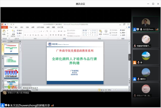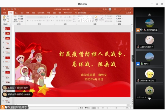 为打赢疫情防控人民战争、总体战、阻击战,深入学习习近平新时代中国特色社会主义思想,提高学生的思想政治水平与综合素质,商学院于2020年6月18日举办了两场思想政治课专题线上讲座,此次思政课由商学院党委书记魏传文、院长朱文忠主讲,殷毅山老师担任主持人,2017、2018、2019级本科学生参与学习。