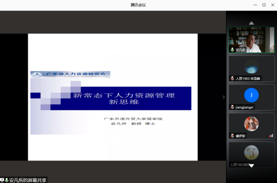 9月3日,商学院在腾讯会议举办“新常态下人力资源管理新思维”分享会。分享会由人力资源管理系主任安凡所教授主讲,人力资源管理专业学生参加分享会。