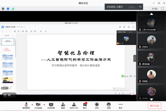 9月3日,商学院在腾讯会议举办了“智能化与伦理——人工智能时代的学习工作生活方式”分享会。分享会由工商管理系宋智勇副教授主讲,工商管理专业近200名学生参加分享会。