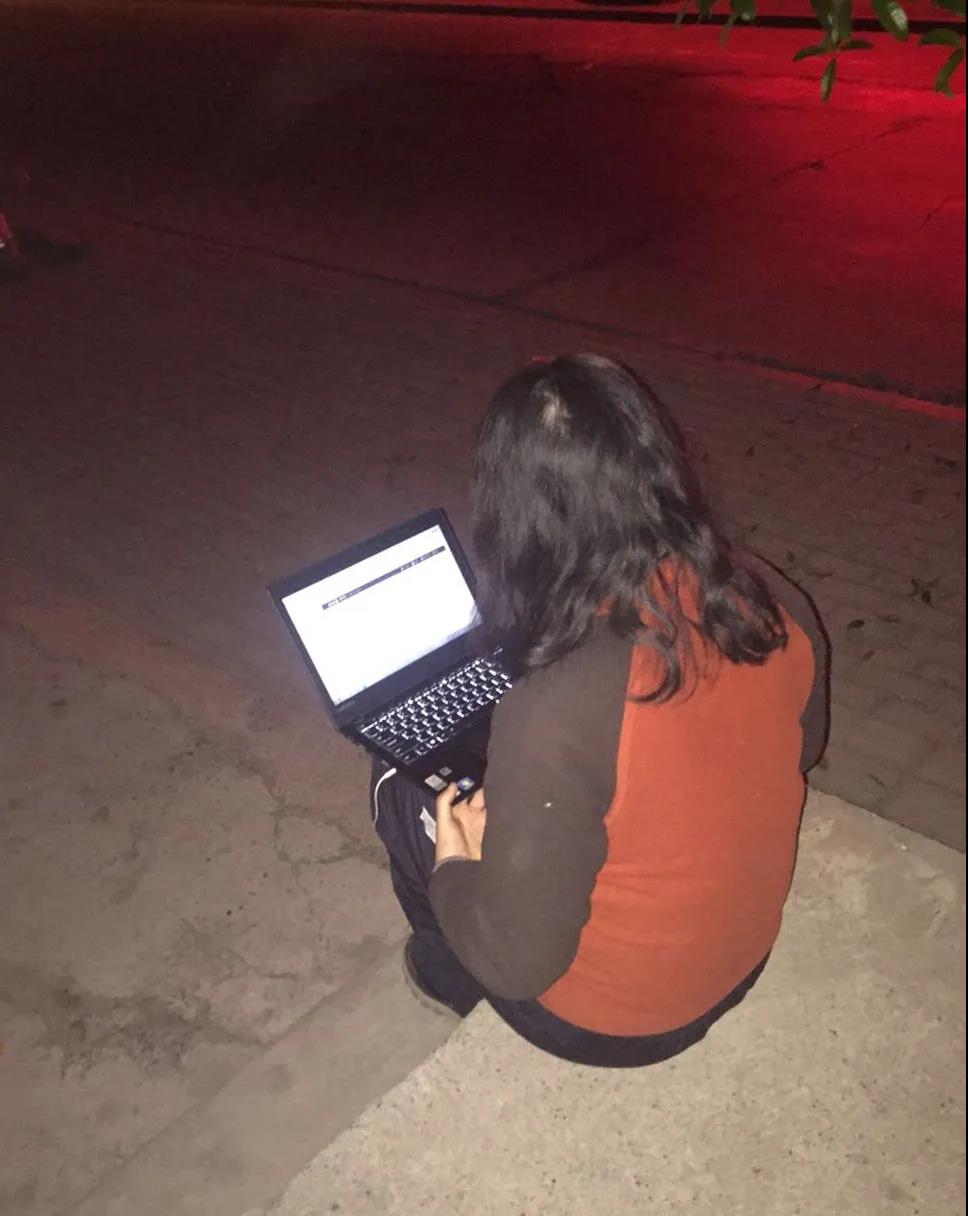 3月23日,在我校开启在线教学的第一天,一张“坐在路边为学生上网课”的照片在金融学院的教学群中备受关注。从照片中我们可以看到天已黑,一位老师捧着笔记本电脑坐在马路牙子上,伴着电脑微弱的光亮和夜晚泛黄的灯光,她沉默的背影在夜色中一丝不苟。