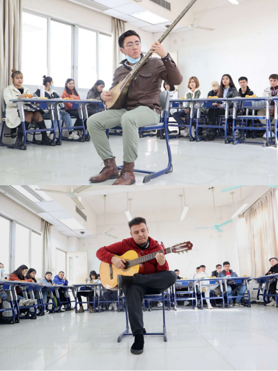 紧接着,卡德尔丁同学和地力亚尔同学分别给大家带来了布尔独奏和吉他弹唱,乐声悠扬,歌声动听,奏唱出了新疆民族的热情与淳朴。