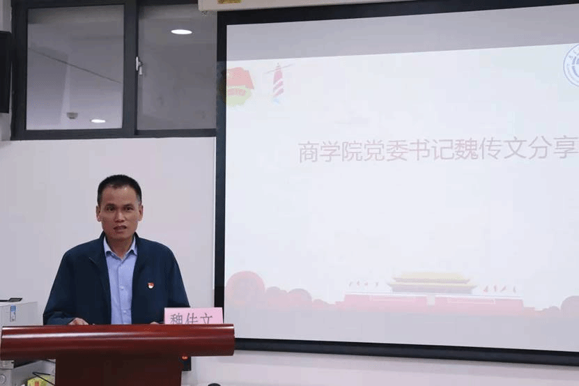 紧接着,魏传文结合学校党委和学院党委要求以及个人学习感悟对于如何认识学党史的深刻意义进行了分享。他带领同学们回顾了习近平总书记在党史学习教育动员大会上的重要讲话,并强调了三个方面的内容:一是党的历史就是一部不断推进马克思主义中国化的历史,就是一部不断推进理论创新、进行理论创造的历史;二是不断总结经验、提高本领,不断提高应对风险、迎接挑战、化险为夷的能力水平是党一步步走过来的重要原因;三是党的历史就是一部践行党的初心使命的历史,是一部党与人民心连心、同呼吸、共命运的历史。魏传文表示,我们要认真领会习近平总书记重要讲话精神,这对开展党史学习教育具有重大的指导意义。同时,魏传文分享了自己学习党史的心得体会,他认为开展党史学习教育,一是牢记初心使命、推进中华民族伟大复兴历史伟业的必然要求;二是坚定信仰信念、在新时代坚持和发展中国特色社会主义的必然要求;三是推进党的自我革命、永葆党的生机活力的必然要求。最后,他谈到,学习党史就要学习党在历史发展中形成的一系列伟大精神的丰富内涵和时代价值,希望同学们能做到习近平总书记所说的学史明理、学史增信、学史崇德和学史力行。