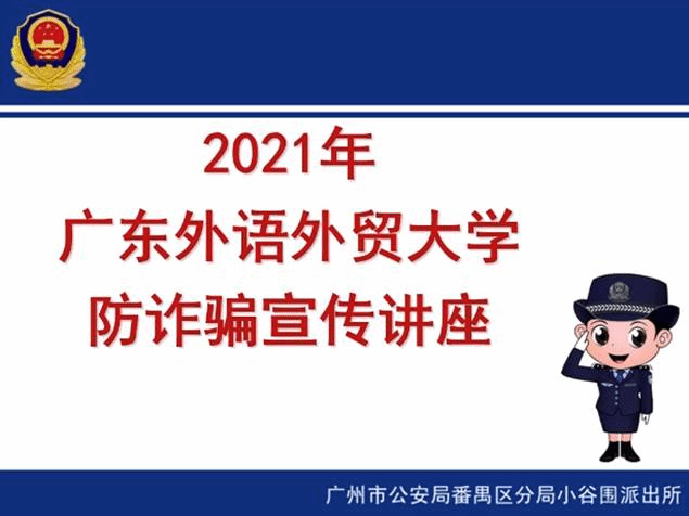 9月6日上午,广东外语外贸大学大学城校区社区民警邱智贤警官在腾讯会议开展“2021年广东外语外贸大学防诈骗宣传讲座”。400多名商学院大一新生参加了本次讲座。
