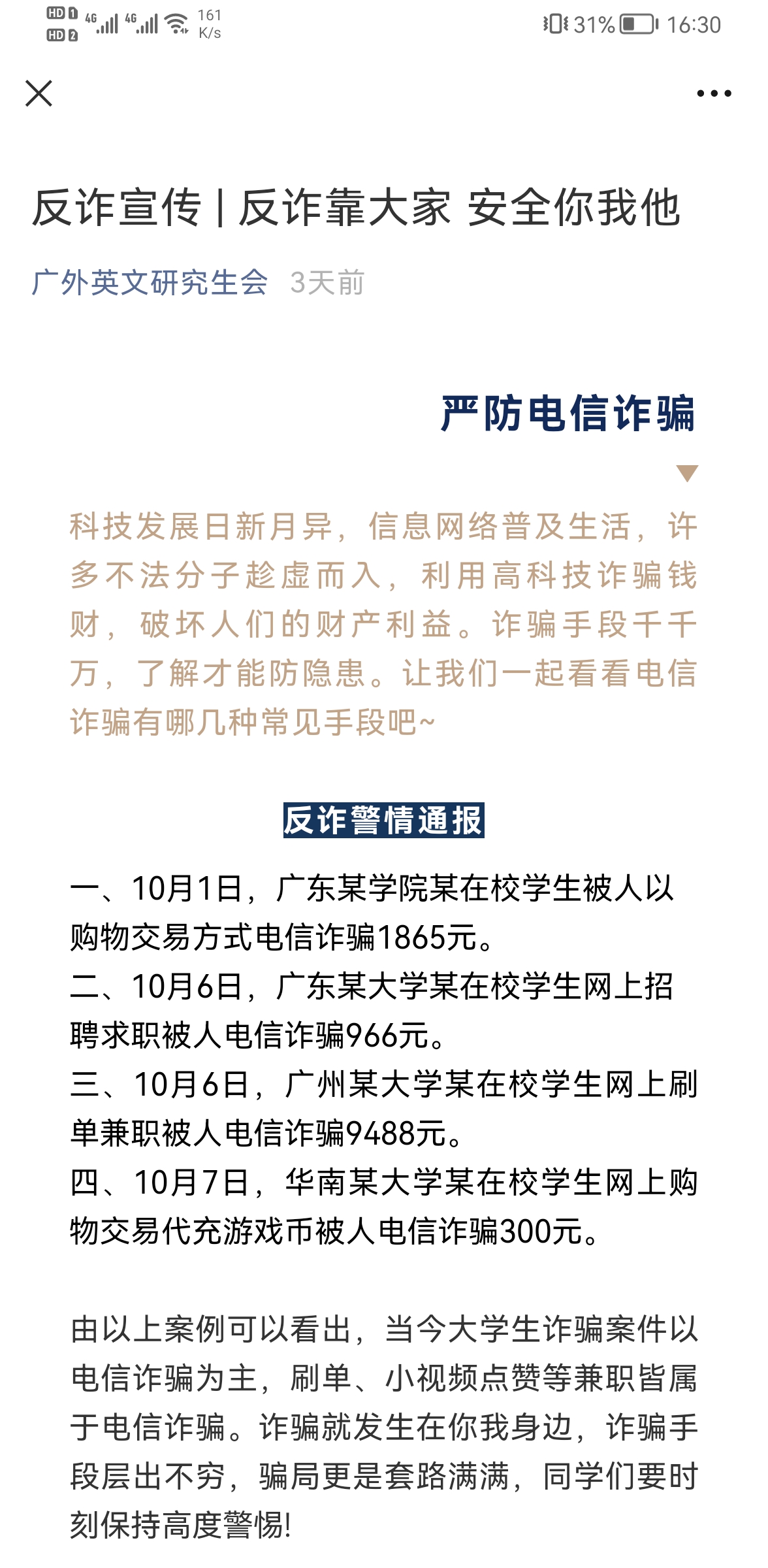 网络推广,实现安全教育全覆盖。除集体教育外,学院利用年级公众号、团学公众号等平台,广泛发布防诈骗小常识等推文,通过线上互动的方式,将反诈知识渗透到学生生活中,意识里。切实提高反诈工作成效。