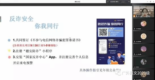 多措并举,加强学生安全防范意识。9月以来,学院本硕各年级辅导员利用国庆假期节点为契机,召开安全主题教育大会,统一传达了十一国庆假期安排和学校假期期间的出入管理办法,疫情防控重要时期,并通过分析了目前全国疫情形势,向同学们强调了非必要不离校、非必要不聚集、非必要不出省三个“非必要”原则。反诈教育安全会上,各年级辅导员组织同学们签订反诈安全承诺书、下载反诈APP,向同学通报了近期诈骗警情,以此警示同学们加强安全防范,同时通过分享自身反诈经历,列举反诈案例等方式教育同学提高意识,确保自身财产安全。