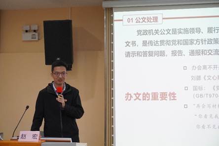 赵宏为同学们详细介绍了公文写作的规范和注意事项。他立足公文处理与文稿撰写两大版块,为同学们讲解了公文种类、四类常用文种写作等方面知识,并以具体公文为例深入讲解了写作的注意事项,深化了同学们对公文撰写的认识。最后,他分享了关于写作的心得“认真细心,关注细节”,帮助同学们更加清晰地认识到了公文写作的功能和意义。