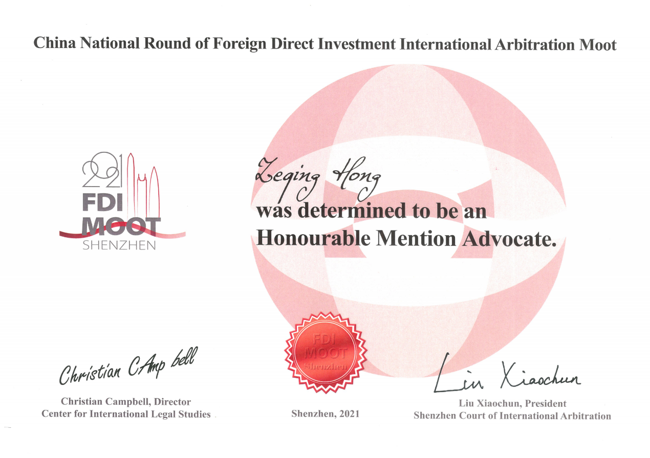 2021年7月31日至8月1日,由深圳国际仲裁院主办的第二届模拟国际投资仲裁深圳杯(Foreign Direct Investment Moot Shenzhen,以下简称“FDI深圳杯”)线上积分赛正式开赛。法学院学子首次组成代表队参加该项赛事,在与香港大学、北京大学、西南政法大学、中南财经政法大学代表队切磋竞技后,代表队队员洪泽清获优秀辩手荣誉。