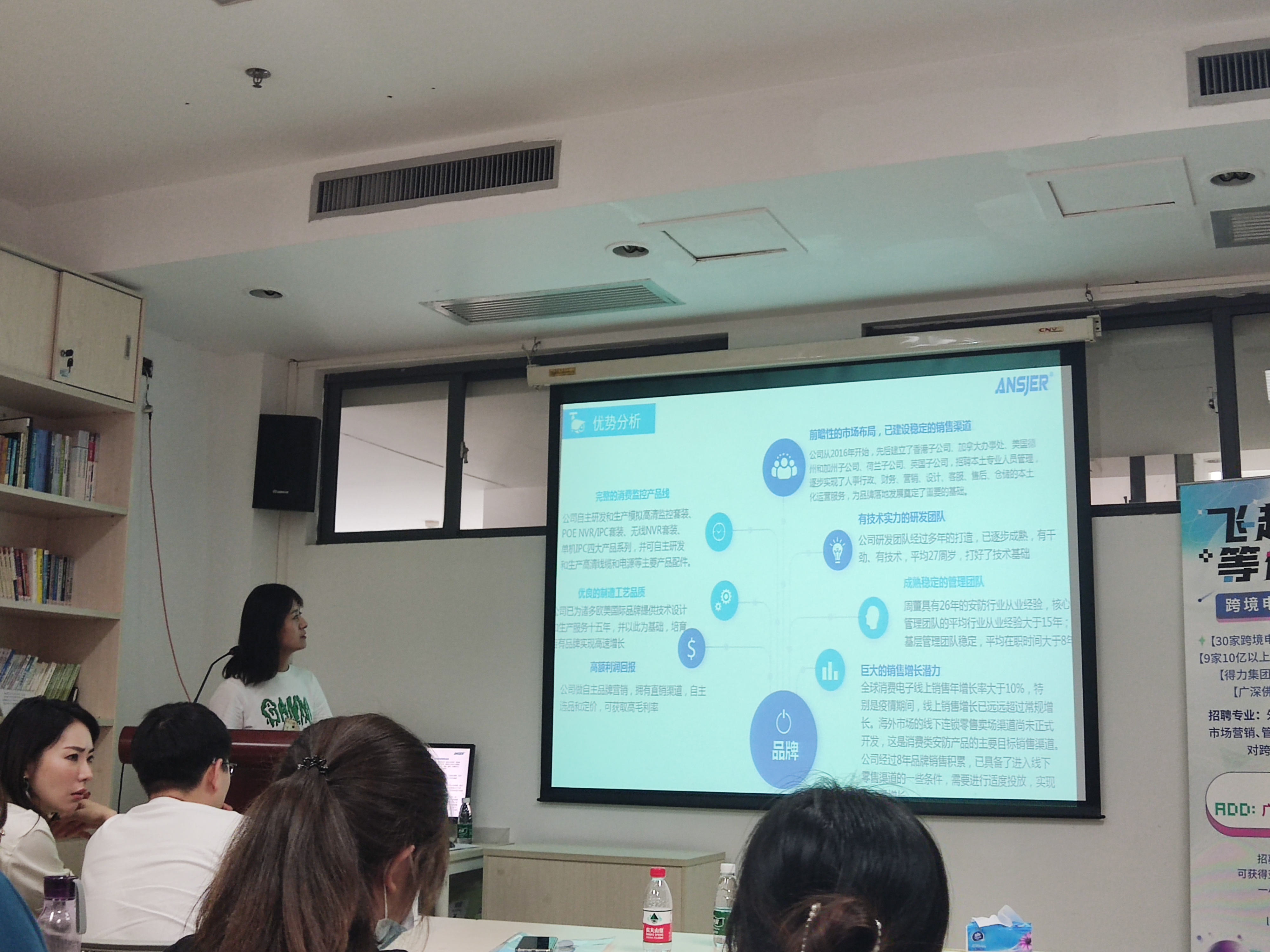 紧接着,广东周视科技有限公司的HR为同学们带来了关于物联网时代的企业新形态的分享,并向同学们介绍他们旗下的五金、线材、核心研发、生产、电子商务等多家子公司。他们致力于为消费者提供全球优质的专业安防监控产品的网购体验,长久以来一直坚持为消费者提供优质服务。此外,HR还热烈欢迎对跨境电商感兴趣的同学们应聘岗位,在工作岗位上发挥自己的才能。