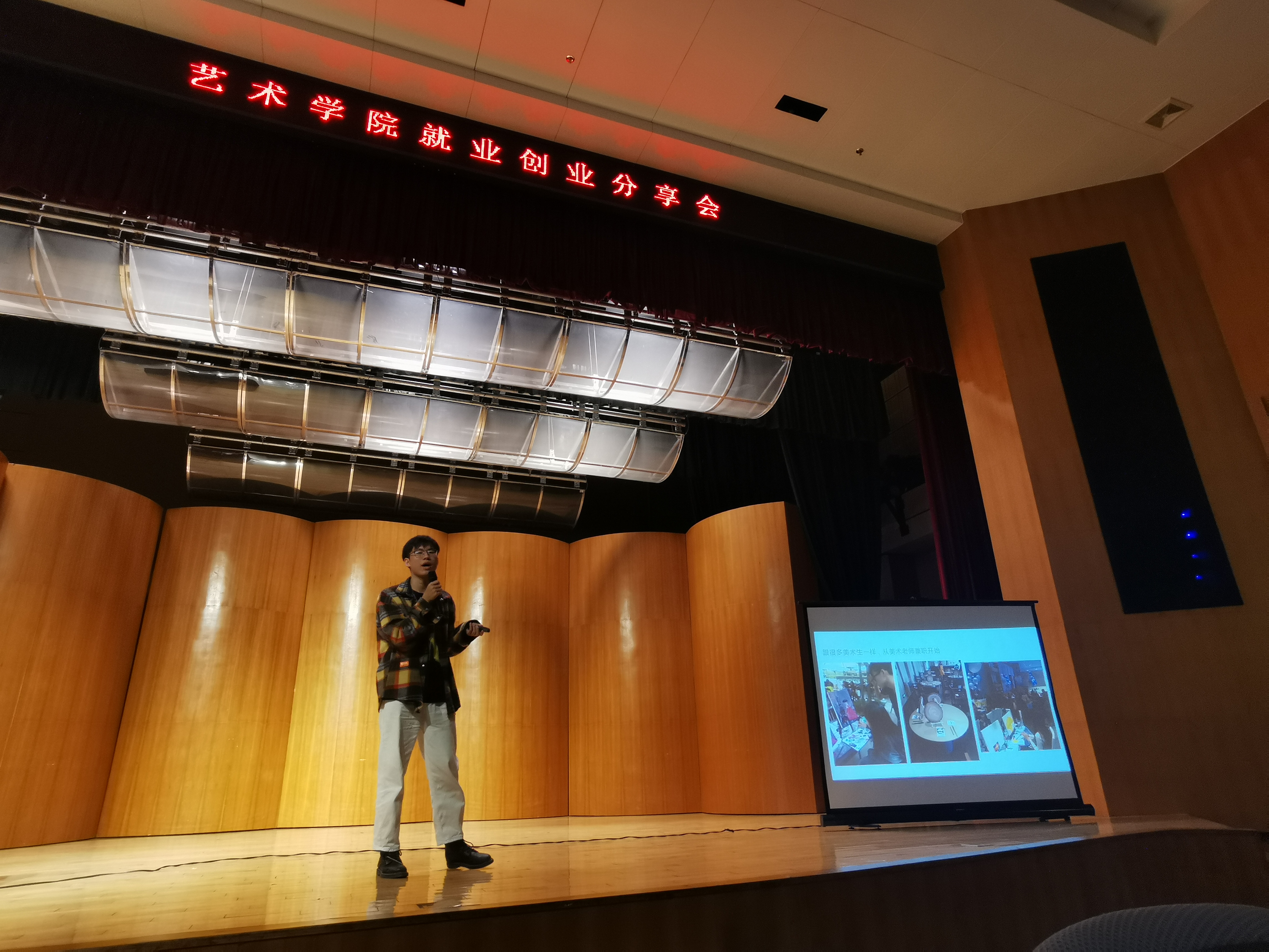 为提高艺术学院学生就业创业意识,激发学生的创新创业动力,11月25日下午,艺术学院在艺术楼小剧场举办就业创业交流会,邀请了广州四阶里文化传播有限责任公司总经理卢水龙,设计副总监袁悠,运营总监、艺术学院2018级数字媒体艺术专业学生梁楚仪与学生进行面对面交流。艺术学院党总支副书记连勇、辅导员林锦松及近百名学生参加了本次交流。