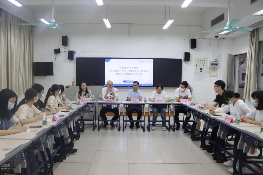 座谈会上,肖荣燊详细地解答了学生代表实习就业方面的相关疑惑。座谈结束后,校友企业广州团爆品网络科技有限公司在教学楼F215召开专场招聘宣讲会。