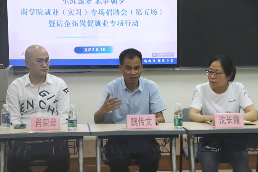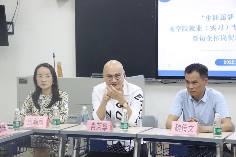 为深入落实访企拓岗促就业专项行动,进一步凝聚校友力量,共同促进2022届毕业生更加充分更高质量就业,5月10日,商学院访企拓岗促就业专项行动座谈会在南校区教学楼F204召开。商学院党委书记魏传文,党委副书记沈长霞,2007届市场营销专业校友、广州团爆品网络科技有限公司董事长肖荣燊,企业代表唐莉凤、何颖珊,辅导员王朕、向媛薇、张哲及学生代表参加座谈会。会议由沈长霞主持。