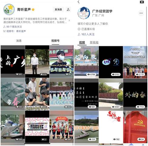 经贸学院在原有的“两微一端一网”的网络育人体系基础上再升级,由校级辅导员工作室视频号“青听星声”领航学院学生视频号“广外经贸团学”,同时结合团委学生会在腾讯视频号、B站、抖音、小红书等短视频平台建设,以思政短视频矩阵新模式打造新媒体平台联盟。