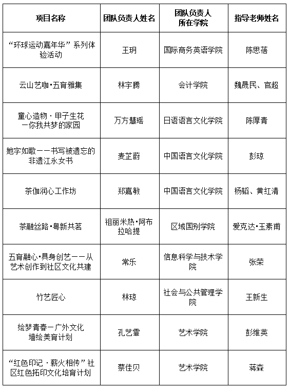 为全面落实立德树人根本任务,推动“先锋型、学习型、平安型、美丽型、活力型”学生社区建设,打造富有广外特色、体现思政要求、贴近学生实际的学生学习、生活、成长共同体,学生工作部于2025年5月7日发布《关于遴选第一批“五育社区·知行广外”学生社区文化培育项目的通知》,共收到24份社区文化培育项目申报书。学生工作部组织社区辅导员、社区学生骨干代表对各团队提交的项目申报书进行评审,共遴选出10个拟立项项目。现将项目立项名单公示如下(排序不分先后)。