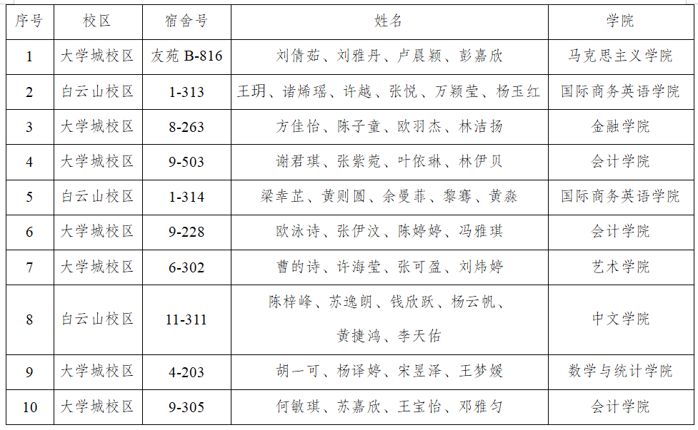 根据《关于开展学生社区第三届“邻里标兵”评选活动的通知》有关要求,经学生宿舍、个人自主申请、学院推荐、专家小组评审和终审答辩会评审,拟确定胡欣琪等5位同学获“社区学生标兵”(含“社区学生党员标兵”)荣誉称号、大学城校区友苑B-816等10个宿舍获“标兵宿舍”荣誉称号。现将名单予以公示。