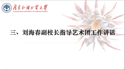 最后刘海春副校长指导艺术团工作进行讲话。刘校在省委党校学习期间,仍然关心、牵挂少数民族学生艺术团的发展。他对艺术团的工作进行了点评与指导,对艺术团的工作给予了肯定,也给艺术团未来的发展指引了正确的方向。他谈到,作为艺术团的一份子,同学们应当做“四有”青年:一是有目标,无论思想、学习或生活都要目标明确;二是有行动,不能做目标上的巨人行动上的矮人,认真刻苦,永不服输;三是有爱好,学习之余不断发展自己;四是有爱心,同学们之间要互帮互助,多关心身边的人,传递爱心,通过多种方式引导同学们树立正确的人生观和价值观。在建党百年之际,艺术团学生干部更应当坚定理想信念,积极开展党史学习教育,努力践行艺术团的理念、宗旨和目标,弘扬民族文化,营造团结和谐的校园氛围。